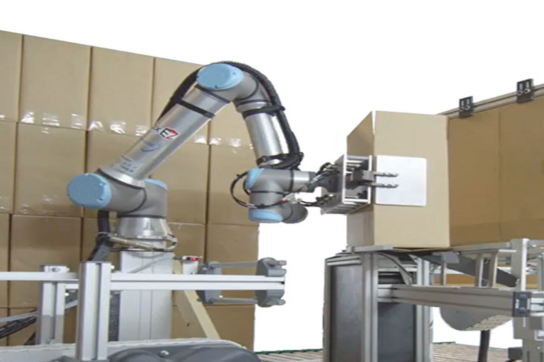 Robot dựng thùng hộpEZ sử dụng Robot vạn năng để dựng các hộp có nhiều kích cỡ một cách hiệu quả với bộ phận tác động cuối được thiết kế tùy chỉnh. Bằng cách kéo các hộp chưa mở từ ổ chứa hộp tự động rồi tạo hình và dán chúng, chúng tôi đảm bảo hoạt động liền mạch. Và bằng cách sử dụng robot cộng tác, chúng tôi giữ cho diện tích của thiết bị ở mức nhỏ trong khi vẫn duy trì tính linh hoạt để lắp đặt nhiều kích cỡ hộp khác nhau.