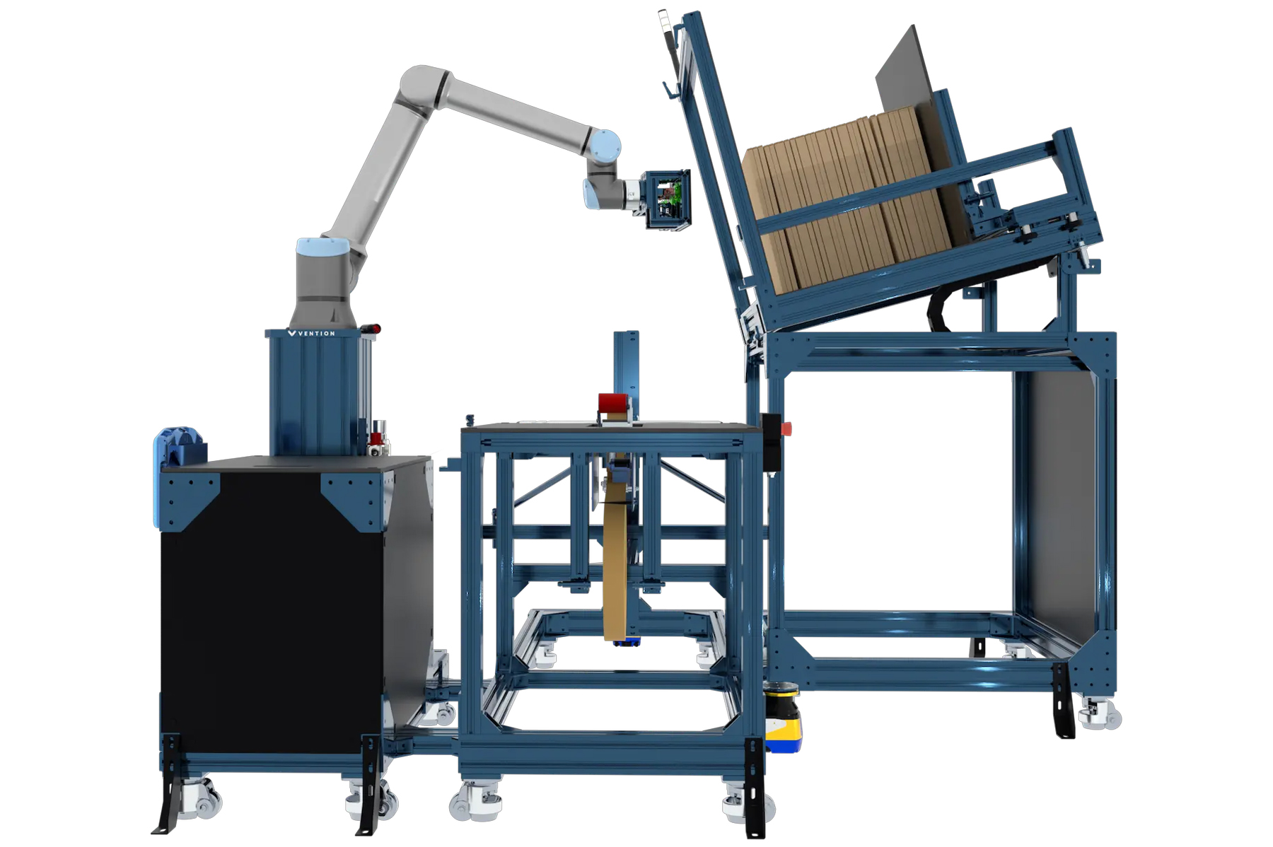 Vention's box erecting solutions are entirely modular and easy-to-operate solutions to erect a wide variety of boxes. This offering can produce up to seven boxes per minute and is adaptable to different box sizes, accommodating multiple SKUs at the same time.