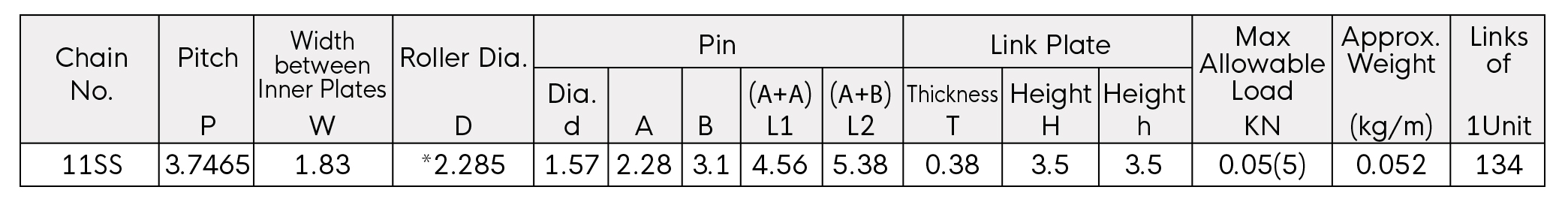 • Kích thước có dấu * hiển thị là đường kính ống lót • Chiều dài tiêu chuẩn là 134 mắt xích • Mắt xích kết nối của 11SS là loại kẹp lò xo và cả hai mặt đều có đinh tán • Chúng tôi không cung cấp mắt xích Offset cho 11SS • Xích 11SS được bôi trơn.
